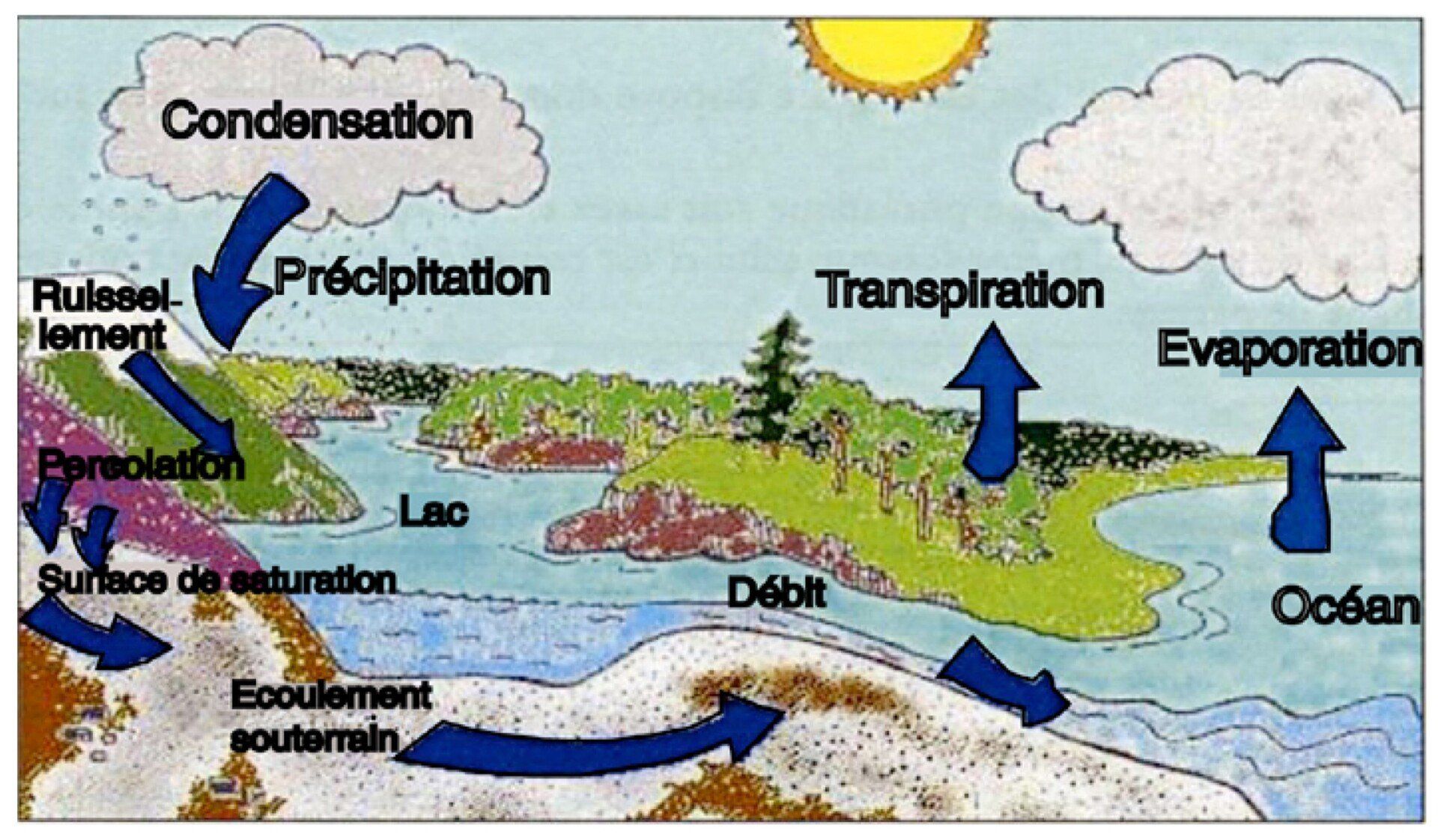 Le cycle de l’eau se déroule à la fois sur terre et dans l’atmosphère : chauffée par le soleil, l’eau des océans et des mers pour 97,20%, l’eau des rivières des fleuves et des lacs pour 0,019% s’évapore. A ce volume s’ajoute la vapeur d’eau issue de l’évapotranspiration des plantes. Toute cette vapeur d’eau monte dans l’atmosphère et se refroidit ; elle condense alors et forme des gouttes ou des cristaux. Les nuages ainsi formés se déplacent avec le vent et laissent échapper leur contenu sous forme de précipitations (pluie, neige, grêle) ou de brouillard. La plus grande partie tombe directement dans les océans ; le reste atteint les continents où 60% s’évaporent à nouveau, seul 25% s’infiltrent dans la terre et alimentent les nappes souterraines et enfin 15% ruissellent et rejoignent les cours d’eau pour retrouver ensuite les océans, et le cycle recommence.